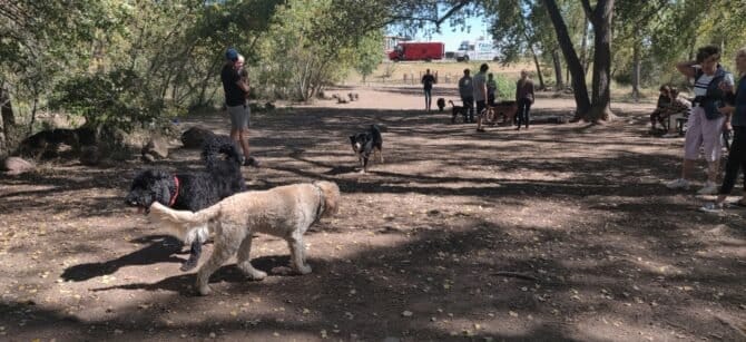 Tony Grampsas Dog Park in Golden, Colorado. Visitors appreciate the park’s spaciousness and cleanliness, with ample shade and water available for dogs. However, some caution about occasional muddy areas and the need for better fencing.