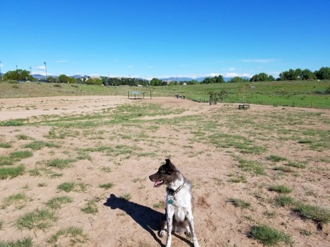 Rover’s Run at Redstone Park in Highlands Ranch, Colorado. Visitors appreciate the park’s cleanliness, ample space, and well-maintained facilities, contributing to a pleasant atmosphere. However, some caution about occasional muddy areas and limited shade.