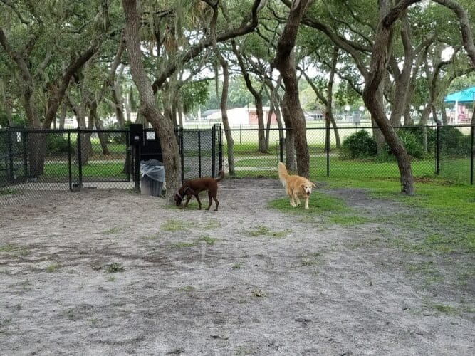 Safety Harbor Dog Park in Safety Harbor, Florida. Visitors appreciate the park’s cleanliness, ample shade, and well-maintained amenities, contributing to a pleasant atmosphere. However, some caution about occasional muddy areas and limited parking space.