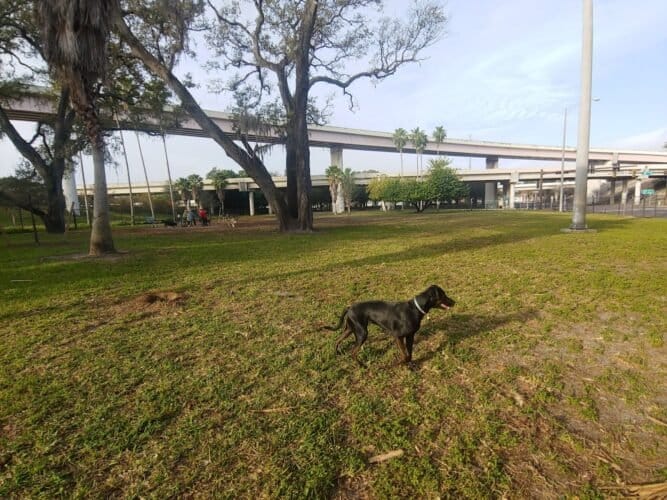 Kenwood Dog Park in St. Petersburg, Florida. Visitors appreciate the park’s cleanliness, ample shade, and well-maintained facilities, making it a pleasant spot for dogs and their owners. However, some caution about occasional muddy areas and limited parking space.