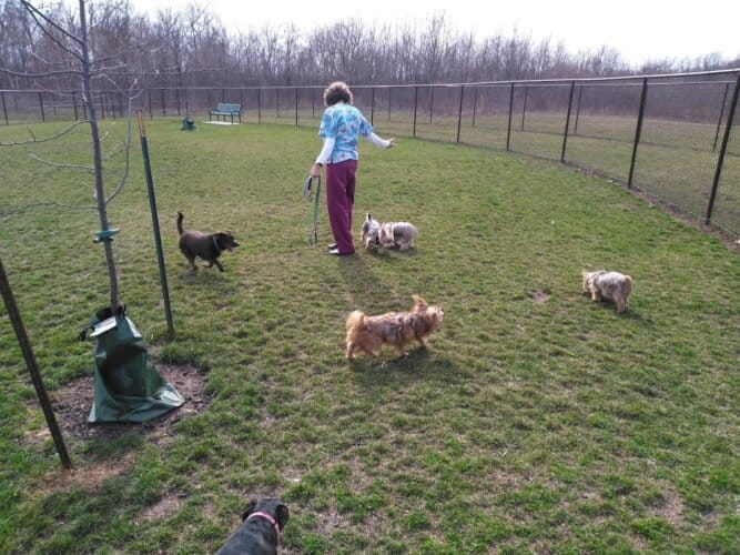 DeVeaux Woods State Park Dog Park in Niagara Falls, New York. Visitors appreciate the park’s cleanliness and spaciousness, with ample shade and a friendly atmosphere. However, some caution about occasional muddy areas and the need for better fencing.