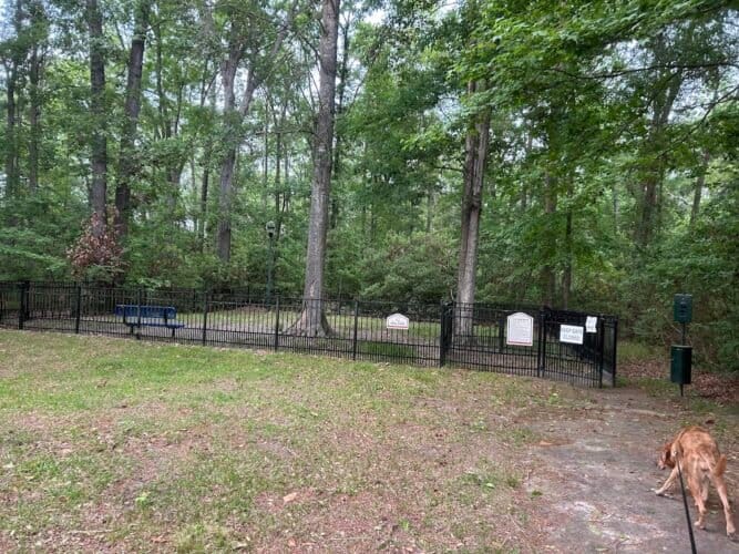 Oldfield Mews Dog Park in Okatie, South Carolina. Visitors appreciate the park’s cleanliness and well-maintained facilities, along with its spacious area and friendly atmosphere. However, some caution about occasional muddy areas and limited shade.