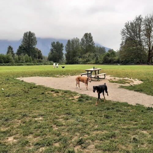 Three Forks Off-Leash Dog Park in Snoqualmie, Washington. Visitors appreciate the park’s spaciousness and cleanliness, with ample room for dogs to run and play. However, some caution about the lack of shade and occasional muddy areas.